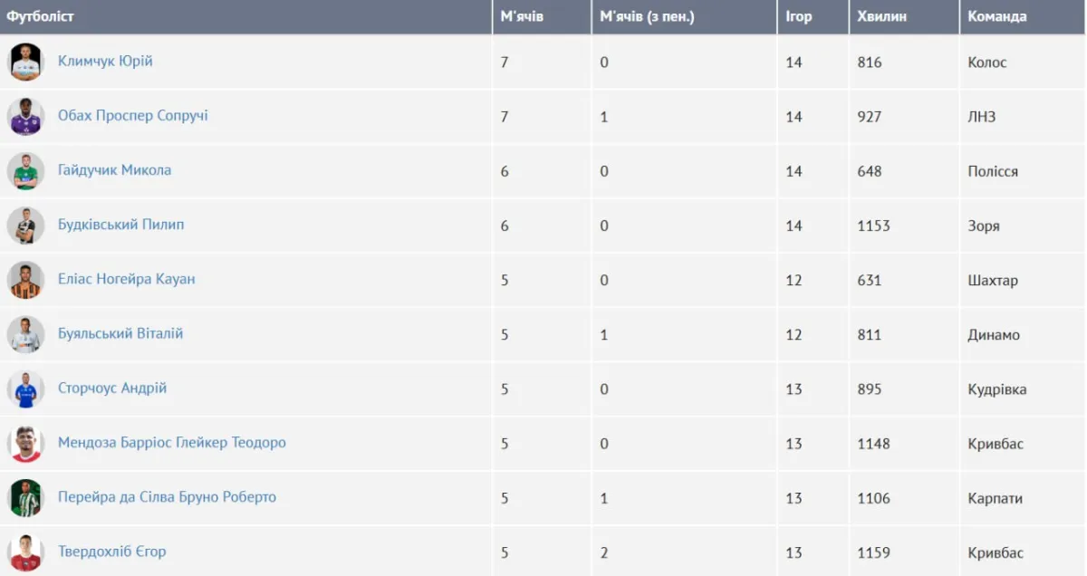 Після 14 турів найкращим бомбардиром УПЛ залишається форвард Колоса Юрій Климчук, який має у своєму активі сім влучних пострілів (за 816 хвилин).