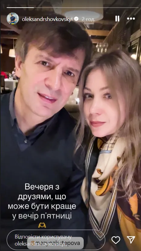 «Вечеря з друзями, що може бути краще у вечір п’ятниці», – написав Шовковський в сторіс в Instagram, на якому зображений він з Кутеповою.