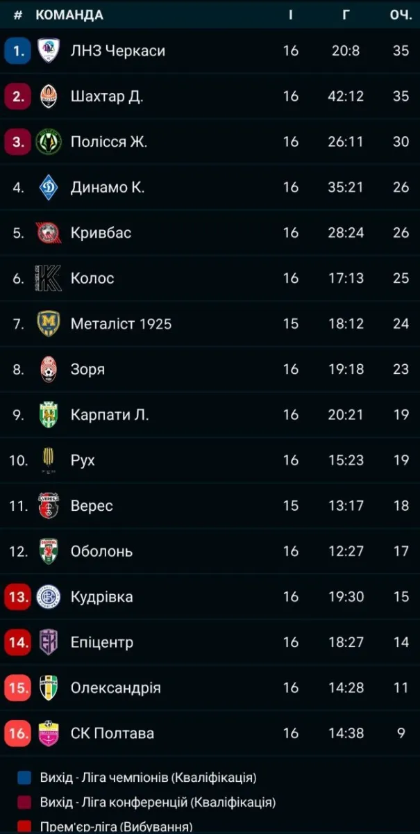 Турнірна таблиця УПЛ після 16-го туру: Шахтар – другий, сенсаційний зимовий чемпіон і Динамо поза топ-3