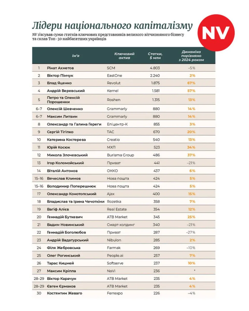 Пов'язані з українським футболом персони потрапили до списку топ-30 найбагатших людей України у 2025 році за версією Nv.ua.