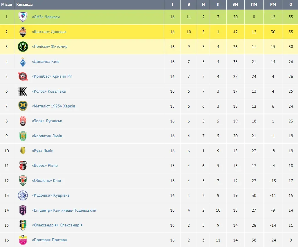 Після літньо-осінньої частини сезону чемпіонату України лідером таблиці є сенсаційний ЛНЗ, який має по 35 балів з Шахтарем і випереджає його за додатковими показниками.