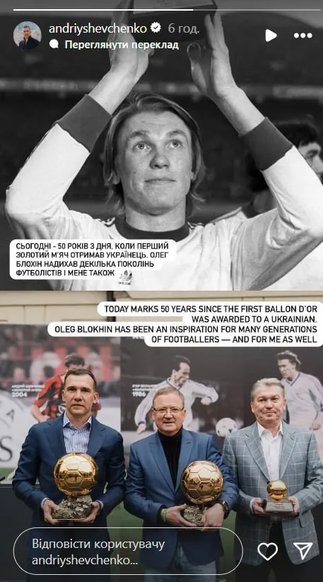 Голова УАФ Андрій Шевченко на своїй сторінці в Інстаграмі виступив із заявою про Олега Блохіна, який відзначає 50 років з дня перемоги у номінації «Золотий м’яч» 1975 року.
