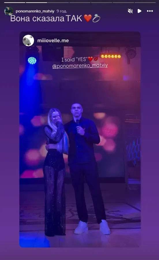 Щаслива пара виклала запальні фото з цього приводу, в тому числі дівчина Пономаренка показала палець з обручкою на ньому.