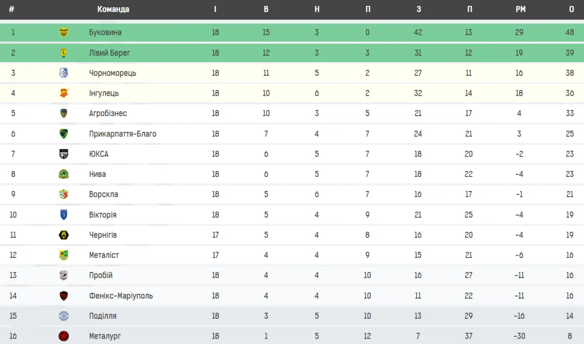- Буковина лідирує в таблиці Першої ліги з 48 очками після 18 турів і має відрив від другого Лівого Берега у дев’ять балів.