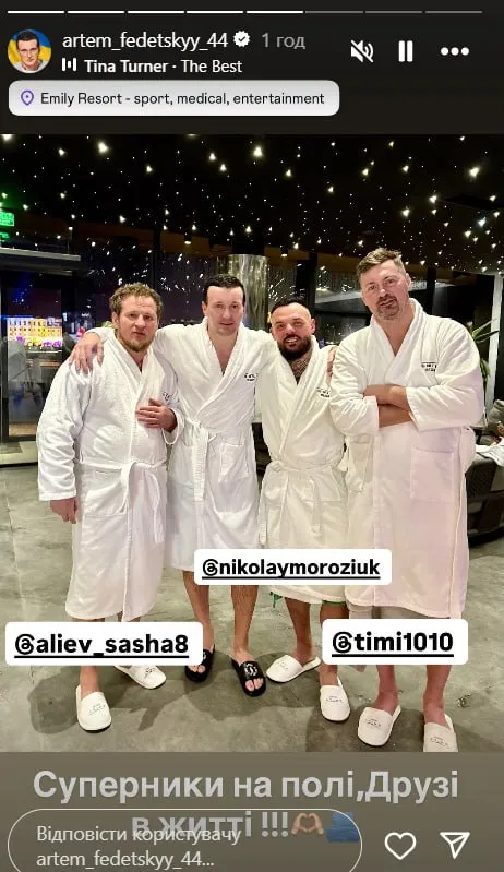 Артем Федецький у сторіс на своїй сторінці в Інстаграмі опублікував фото з відпочинку в преміальному готелі Emily Resort разом з Миколою Морозюком, Артемом Мілевським та Олександром Алієвим.