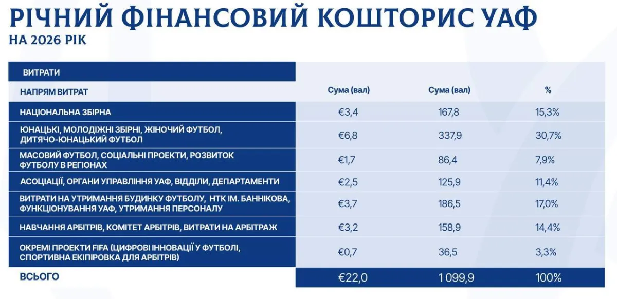 Крім того, представлено річний кошторис УАФ на 2026 рік із застереженням, що в ньому не передбачені витрати, пов'язані з можливою участю збірної України у ЧС-2026, однак у разі виходу команди на турнір асоціація розраховуватиме на додаткове фінансування з боку ФІФА.