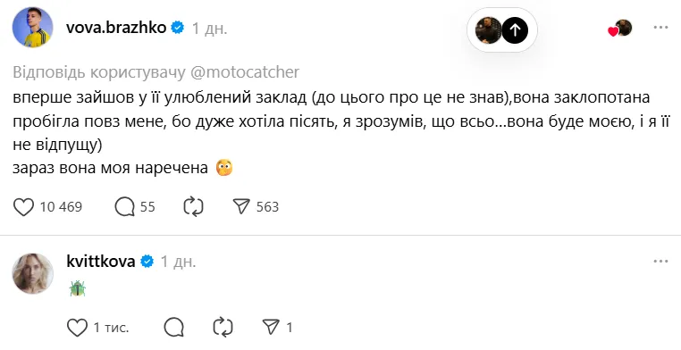 Відзначимо, що Квіткова не пройшла повз цього зізнання свого обраниця, відповівши емодзі жука.