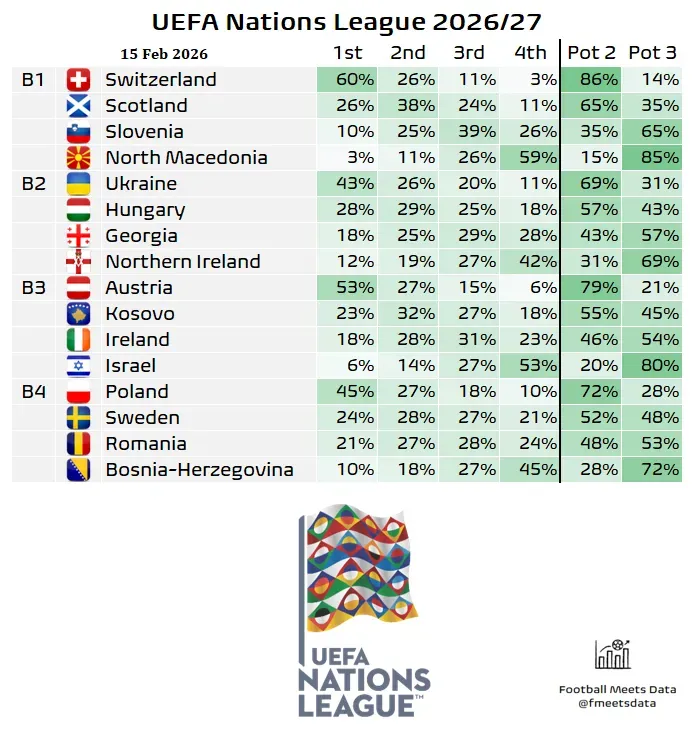 Аналітики з Football Meets Data у власному Х-акаунті показали прогноз на новий сезон Ліги націй 2026/27.