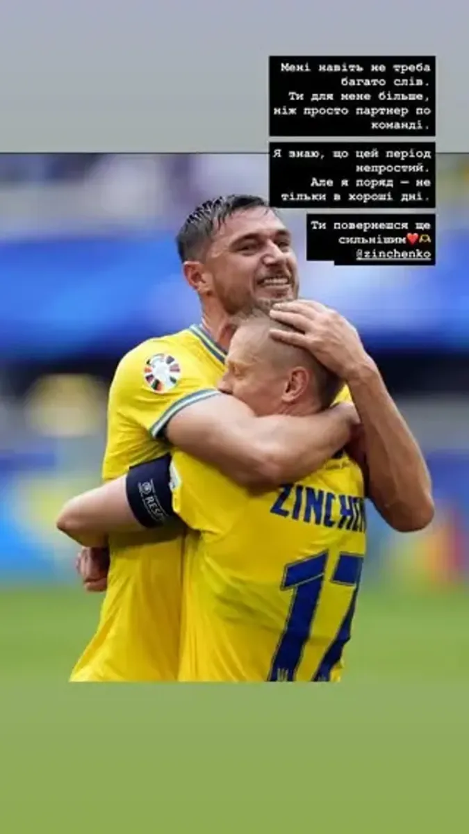«Мені навіть не треба багато слів. Ти для мене більше, ніж просто партнер по команді. Я знаю, що цей період непростий. Але я поряд – не тільки в хороші дні. Ти повернешся ще сильнішим».