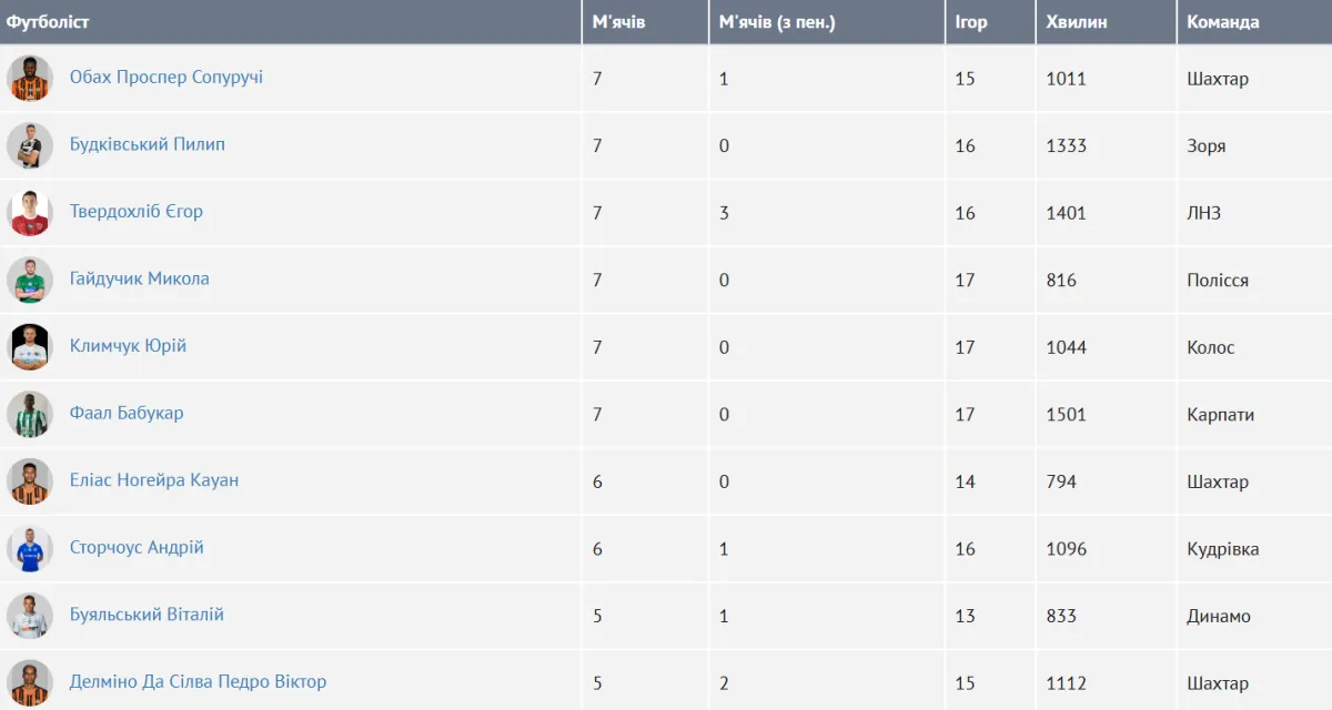 Другу позицію займає нападник і капітан Зорі Пилип Будківський, якому потрібно було 16 ігор, щоб сім разів відзначитися у воротах суперників. Третє місце посідає хавбек ЛНЗ Єгор Твердохліб. Він забив сім голів (три – з пенальті) у 16 поєдинках за Кривбас.