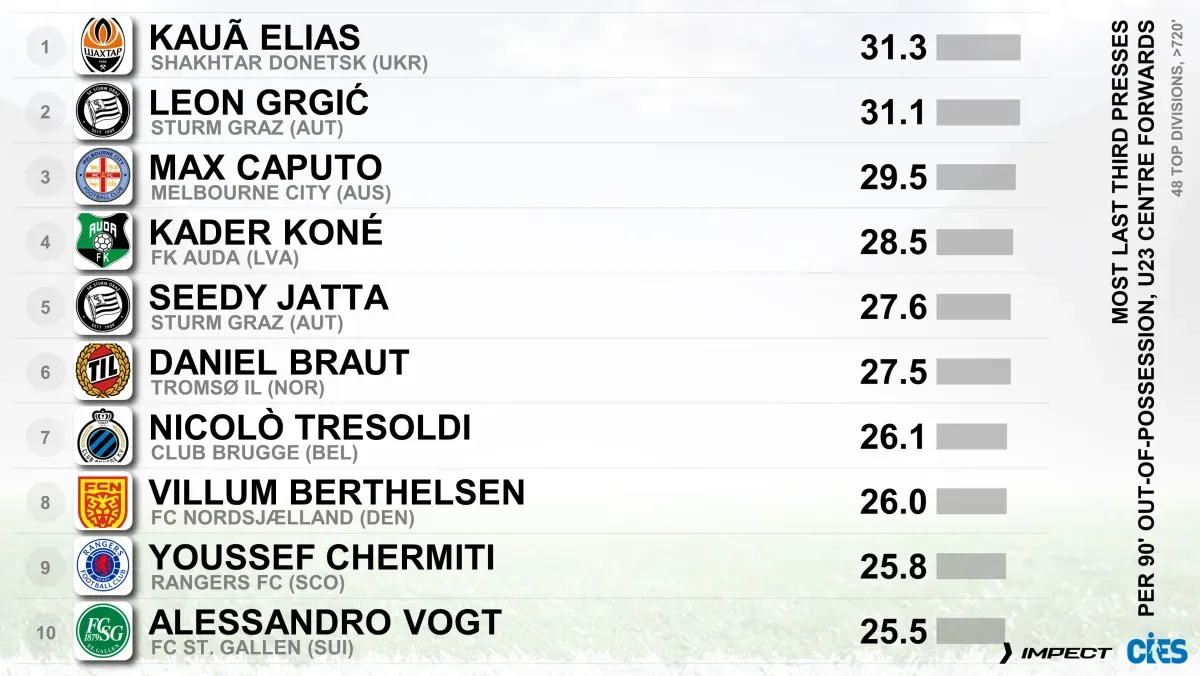19-річний страйкер «гірників» став найкращим у світі у віці до 23 років у своєму амплуа за інтенсивністю пресингу в останній третині поля суперника, здійснюючи 31,3 спроби відбору за 90 хвилин.