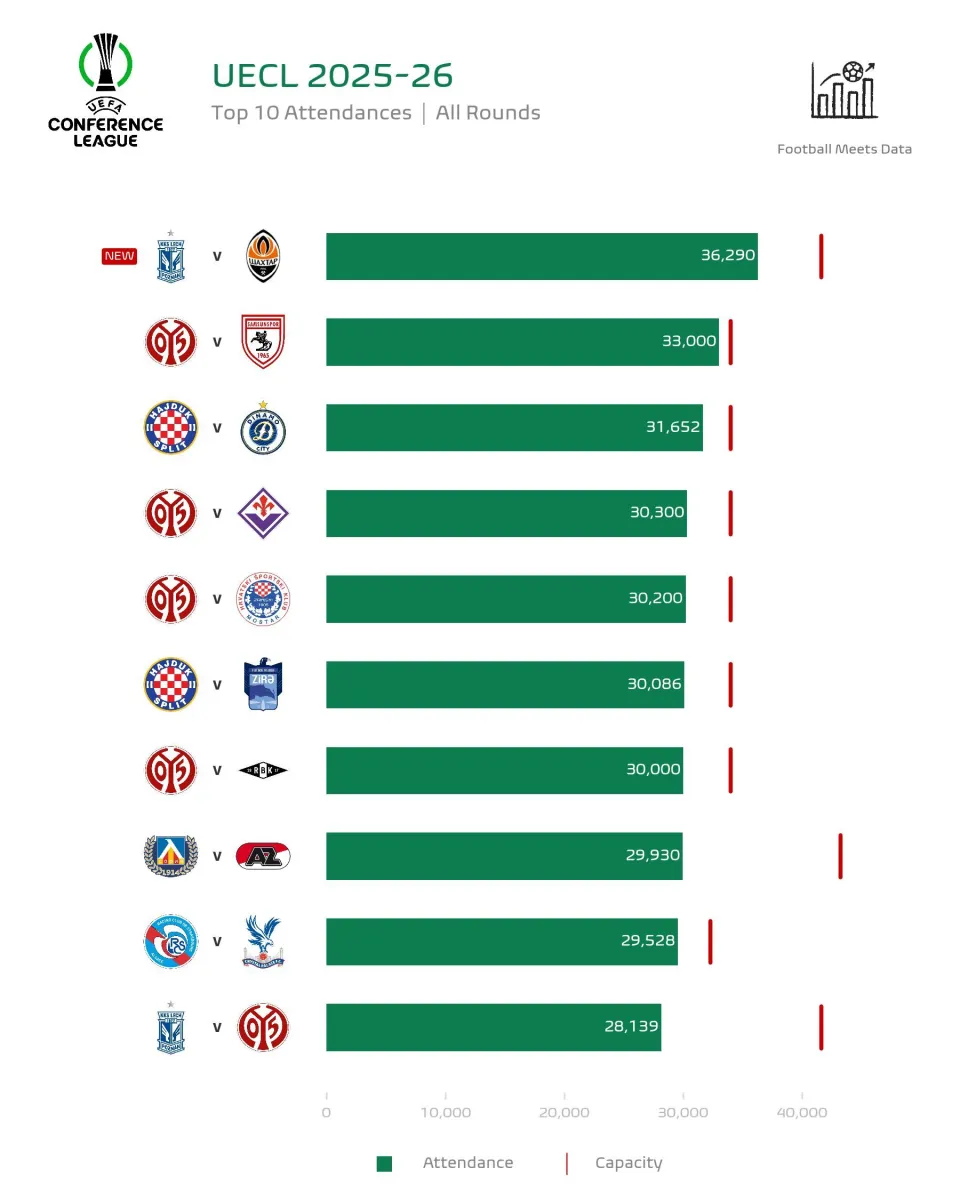 Перший матч 1/8 фіналу Ліги конференцій між Лехом і Шахтарем (1:3) встановив рекорд сезону у Лізі конференцій за відвідуваністю.