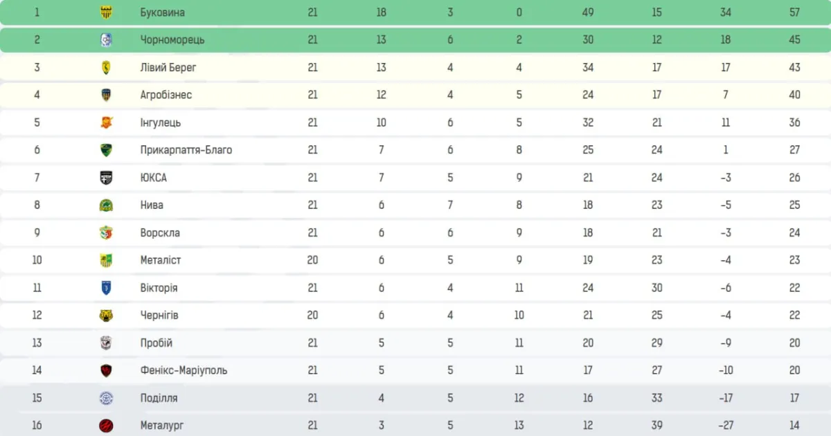 У суботу, 4 квітня, було завершено 21-й тур Першої ліги. У зоні прямого виходу в УПЛ перебувають чернівецька Буковина та одеський Чорноморець.