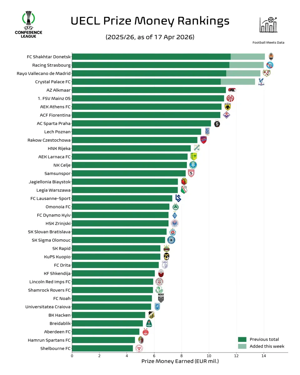 Шахтар лідирує за сумою отриманих призових у Лізі конференцій сезону 2025/26. Як пише портал Football Meets Data у мережі Х, вихід у півфінал турніру приніс «гірникам» додатково 2.5 млн євро. Загальний дохід донеччан складає вже 14.1 млн.