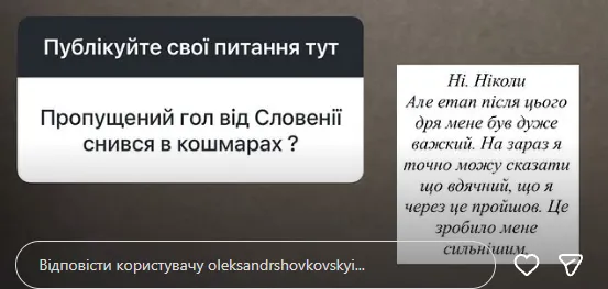 «Гол не снився в кошмарах. Ніколи. Але етап після цього для мене був дуже важкий. На зараз я точно можу сказати, що вдячий, що через це пройшов. Це зробило мене сильнішим», – розповів Шовковський у своєму Instagram.
