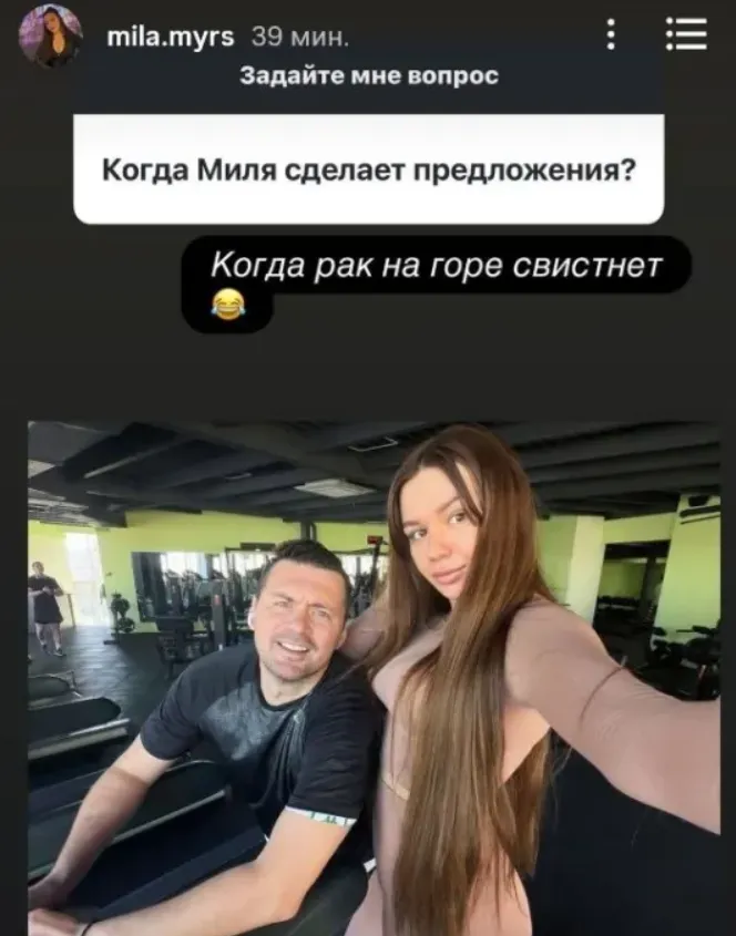 Обраниця колишнього форварда Динамо та збірної України Артема Мілевського, Таміла, у своєму Instagram поділилася планами щодо їхнього можливого весілля. Судячи із реакції дівчини, поки що церемонія не планується.