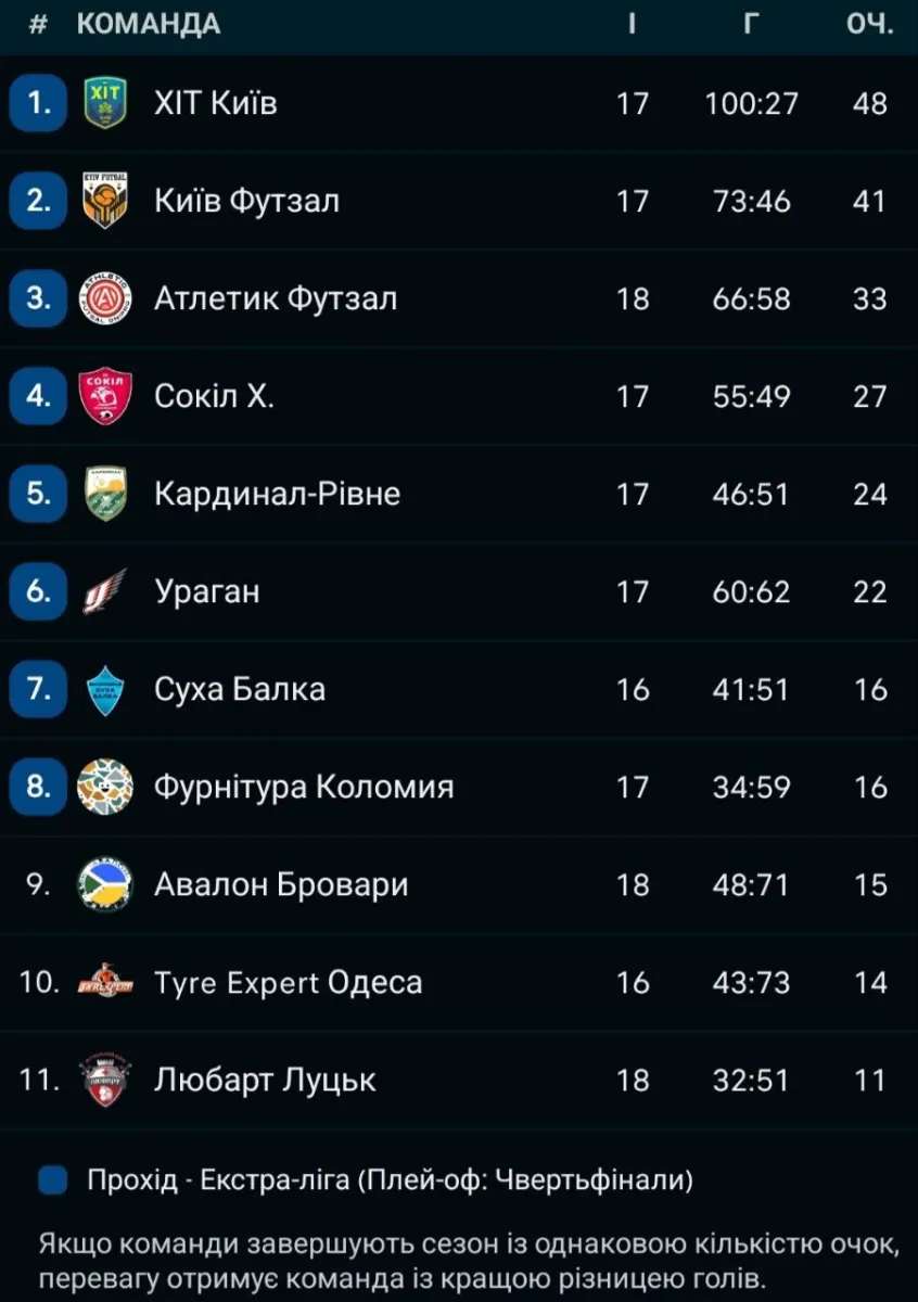 Наразі лідером турнірної таблиці національної першості є ХІТ, на другому місці розташувався Київ Футзал, а третю сходинку займає Атлетик Футзал.