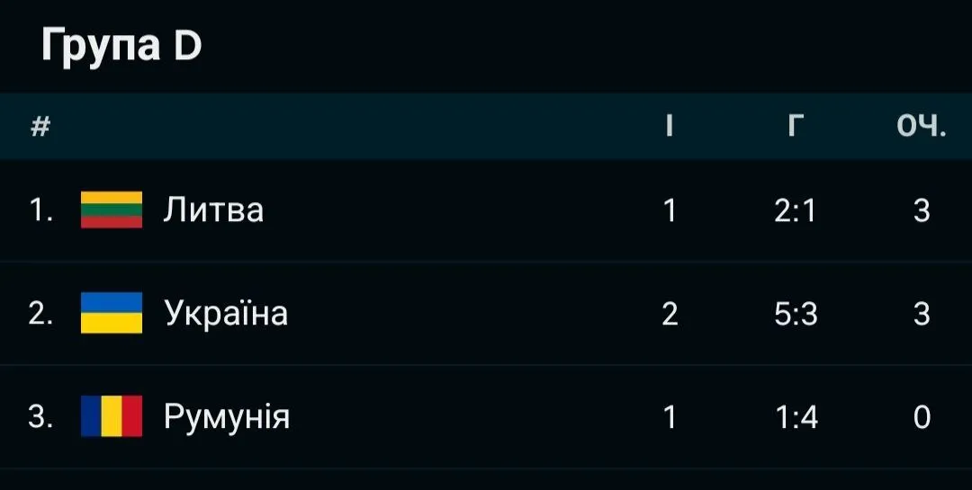 - У першому матчі своєї групи, що поки що складається лише з трьох команд, Україна поступилася з рахунком 1:2 Литві.