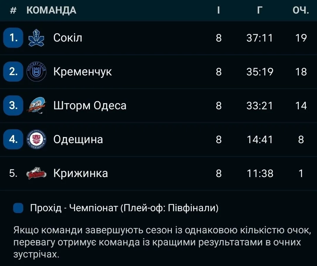 Сокіл розгромив новачка чемпіонату України з хокею в матчі з 9-ма шайбами: турнірна таблиця