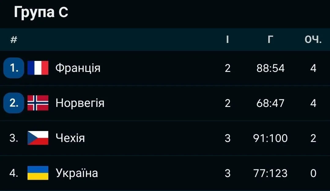 - Раніше у стартовому матчі групового етапу синьо-жовті програли Норвегії (22:39), а потім поступилися французам (26:46).
