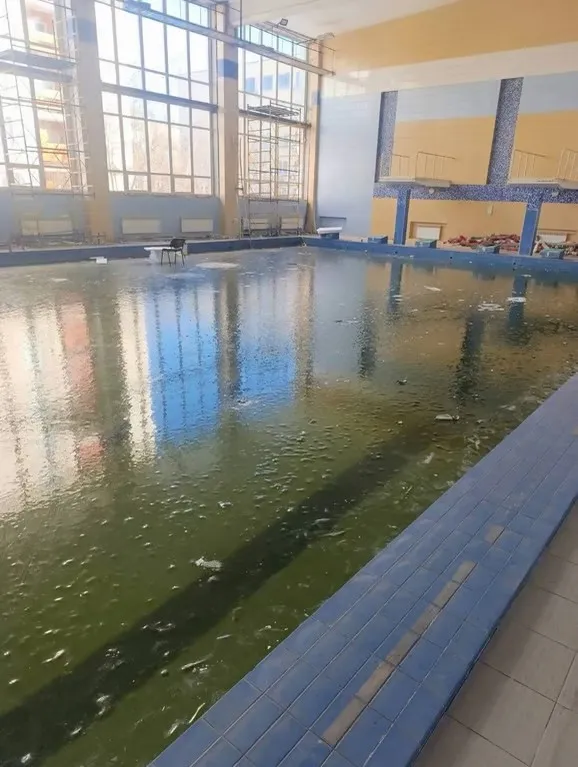Вибухова хвиля від дронів-камікадзе повибивала вікна, через що будівля втратила захист від низьких температур. У результаті вода в басейні повністю замерзла, а товщина крижаного покриву сягнула приблизно 10 сантиметрів.