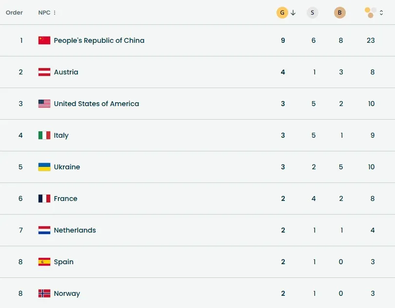 В активі «синьо-жовтих» залишаються три золотих, дві срібних і п’ять бронзових нагород. Наша команда опустилася з другого на п’яте місце медальних перегонів, пропустивши вперед Австрію, США та Італію.