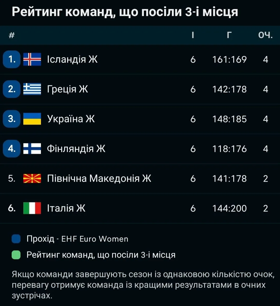 - У своїй групі українки поступилися Швеції та Сербії, але обійшли Литву, тоді як в рейтингу третіх місць вище за Україну фінішували Ісландія та Греція, а наша збірна виявилася кращою за Фінляндію, Північну Македонію та Італію.