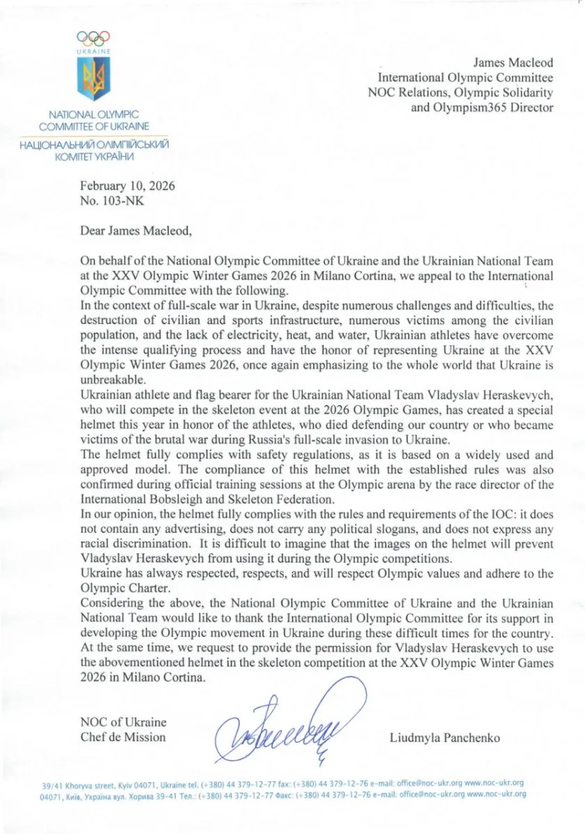НОК України звернувся до МОК з проханням дозволити скелетоністу Владиславу Гераскевичу виступати на зимових Олімпійських іграх-2026 у спеціальному «шоломі пам’яті», повідомляє пресслужба організації.