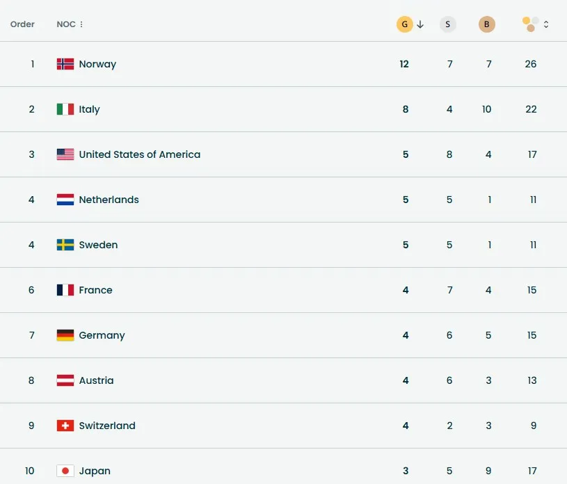 Після дев’яти медальних днів Олімпіади командний залік продовжує очолювати Норвегія, спортсмени якої вибороли 12 золотих, сім срібних і стільки ж бронзових нагород.
