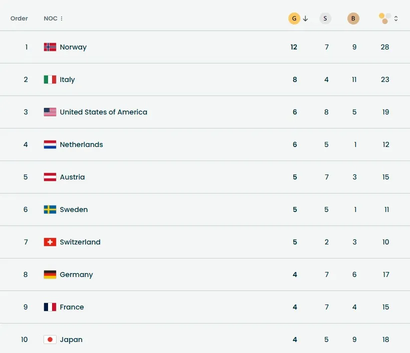 В активі збірної Норвегії після десяти медальних днів 28 нагород, 12 з яких – найвищого ґатунку. Італія завоювала рекордні для себе 23 медалі і має на чотири «золота» менше.