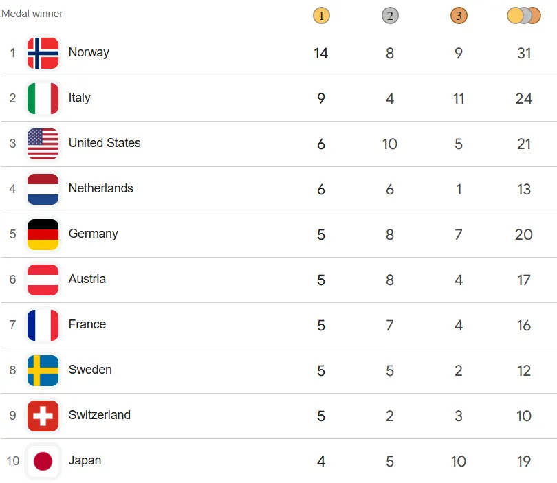 У медальному заліку впевнено лідирують норвежці із 14 золотими, 8 срібними і 9 бронзовими медалями. У топ-3 також Італія та США.
