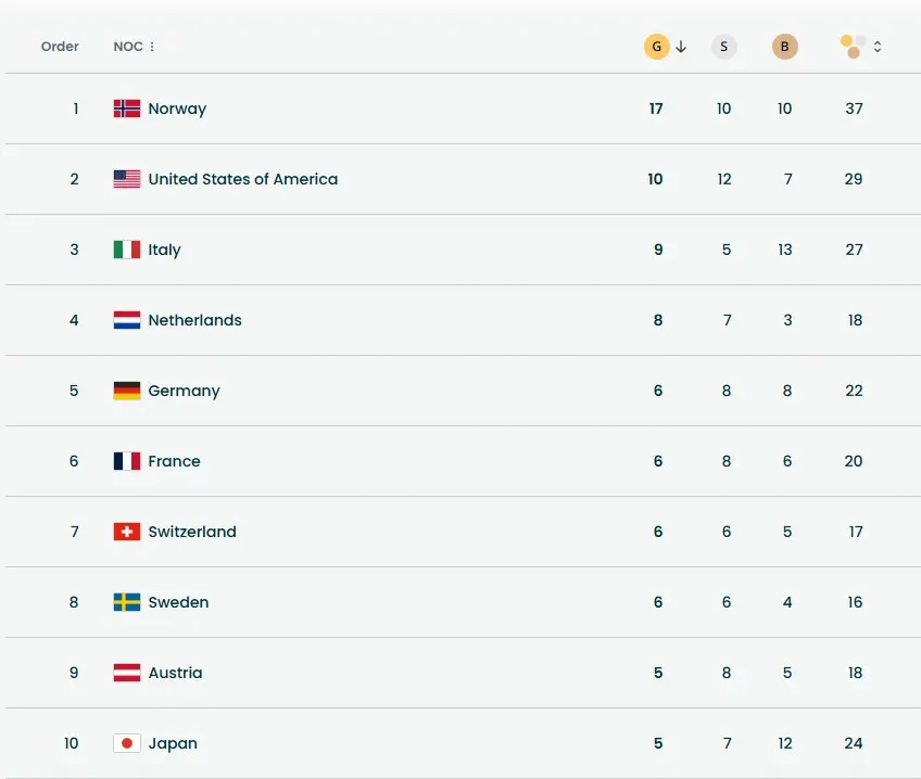 Загалом на подіум Олімпіади-2026 уже підіймалися олімпійці 27 країн. Вашій увазі десятка найкращих збірних на цей момент.