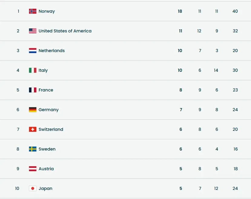 Загалом на подіум Олімпіади-2026 підіймалися олімпійці 29 країн. Вашій увазі десятка найкращих збірних на цей момент.