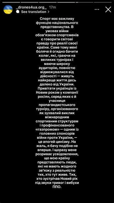 «Мені боляче й огидно бачити колег, які, граючи на великих турнірах і маючи широку аудиторію, повністю відмежувалися від дійсності – живуть найкраще життя десь далеко від України. Привітати українців із Новим роком у компанії росіян, це апогей цинізму. Мені соромно мати таких колег».